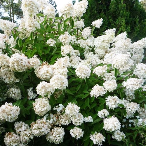 Листопадний декоративний чагарник висотою до 1,8-2 м з міцними темно-червоно-коричневими гілками. Листя загострене, темно-зеленого кольору, довгасто-еліптичні з яскраво-вираженим дугоподібним жилкуванням. Рясно цвіте з липня до вересня. Суцвіття пишні, великі, пухкі волоті конічної або пірамідальної форми до 25-30 см завдовжки, вершково-білого кольору, які восени на сонячних місцях рожевіють. Суцвіття становлять фертильні квітки та великі стерильні крайові квітки. Росте швидко. Максимальних розмірів досягає після 10 років.