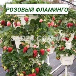 Полуниця Рожевий Фламінго - унікальний сорт ремонтантної полуниця з рожевими квітками, вирощується як для декоративного, так і садового застосування. Найчастіше підвішується на вікна з відстанню між горщиками 20 см. Вона дає довгі вуса, які звисають у вигляді ліан. Плоди яскраво – червоного кольору середнього розміру масою до 20 гр. Стійкість до захворювань висока.