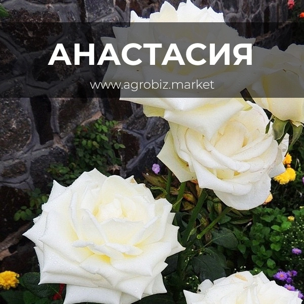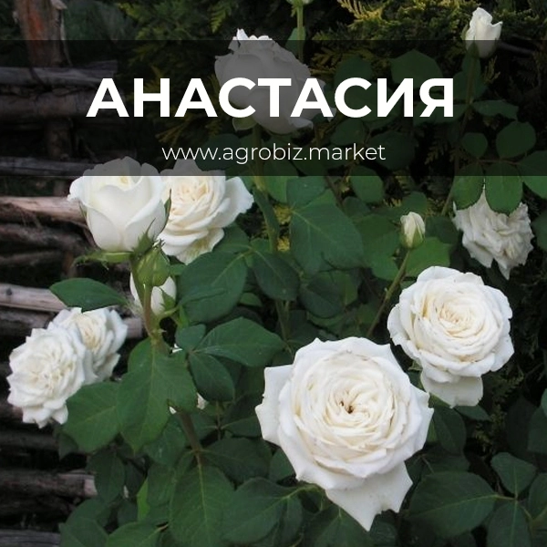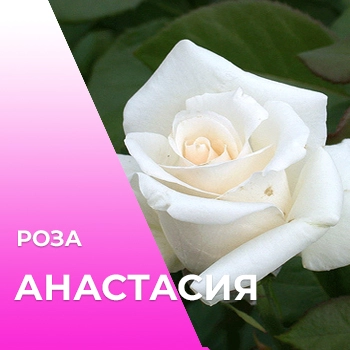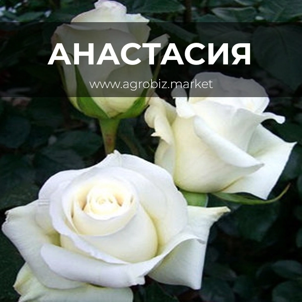 троянда Анастасія – чудова, елегантна троянда, що відноситься до чайно-гібридних видів. У висоту кущ досягає 110 см, шириною до 90 см, стебла сильні, прямі з малою кількістю шипів. Листя глянсове, темно-зеленого кольору. Цвіте великими квітами в діаметрі до 11 см, бутон має класичну келихоподібну форму. Колір білий з легким рожевим відтінком, квітка махрова, налічує до 40 пелюсток в одному бутоні. Бутони розпускаються повільно, цвітіння повторне, рясне, квіти розташовуються на пагонах кистями, іноді поодиноко. Випускає ніжний аромат, що трохи нагадує аромат груші. Сорт троянди Анастасія має середню стійкість до захворювань і відноситься до морозостійких сортів, а також стійкий до дощу. На зиму рекомендується вкривати, особливо це стосується широт, де середня зимова температура довго тримається на мінусовій позначці. Висаджувати троянду необхідно на добре освітленому, сонячному місці. Важливо врахувати, щоб у радіусі одного метра від майбутнього місця посадки не було жодних чагарників, а також щоб у радіусі 2-3 метри були відсутні дерева. При посадці троянди потрібно поглибити місце щеплення на 8 см у ґрунт. Після посадки ґрунт навколо коренів ущільнити та полити.