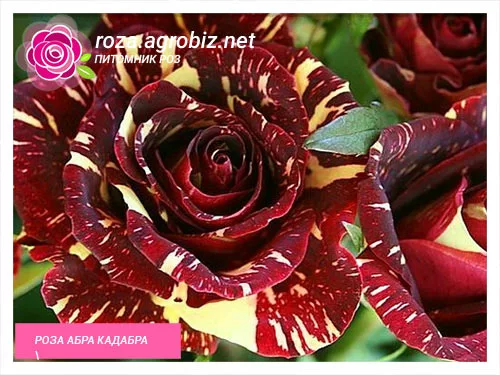 Роза чайно-гібридна Абра кадабра. Це одна з найбільш незвичайних троянд коли-небудь вирощених. Цвіте дуже яскраво та приголомшливо. Вся квітка покрита численними смужками та плямами різних відтінків від легких та сильних жовтих з рожевим та фіолетовим.