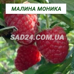 Малина Моніка - сорт штамбової малини середнього терміну дозрівання (перша декада липня). Моніка придатна для вирощування на шпалерах. Ягоди дуже великі 10-12 г, рубінові, конічні, щільні. Смак ягід солодкий з приємним малинним ароматом. Високоурожайність 4-5 кг з куща. Плодоносить щорічно, дозріває з початку липня. Кущ високий, потужний, безшипний. Зимостійкість помірна до -30. Стійкість до посухи, до всіх хвороб та шкідників на рівні кращих стандартних сортів. При наявності хвороб не знижує своїх високих урожаїв.