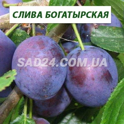 Особливості сорту Слива Богатирська - середньоранній сорт російської селекції, що успішно вирощується в Україні вже понад 50 років. Частково самоплідний сорт із великими плодами, гарного смаку, універсального призначення. Дерево з кроною середньої густоти, висотою до 4 м. Овальні сливи 35-40 г, деякі до 50 г, гарного смаку з жовто-зеленою м'якоттю, кісточка. мало відокремлюється. Шкірка темно-фіолетова, густо вкрита сизим восковим нальотом. У молодих саджанців сливи – ndash; крона піднята, у дорослих дерев – ndash; більш розлога. Сорт частково самоплідний, але й без додаткових запилювачів дерево дає до 50 кг плодів за сезон. Цвітіння – Початок травня, урожай готовий до збирання після 15 серпня. При висадженні однорічних саджанців зливу починає давати віддачу з 3-4 сезону. Дерева плодоносять стабільно, щорічно. Дуже висока стійкість до морозів, чудова здатність відновлюватись після несприятливого періоду. Залежно від підщепи дерева повноцінно плодоносять до 30 років.