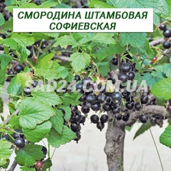 Чорна смородина на штамбі Софіївська - щеплений на штамбі близько 50 см. Відмінний сорт смородини середнього терміну дозрівання, з високою стійкістю до захворювань , гарною, регулярною врожайністю. Селекція відомого селекціонера К. Н. Копаня. Сорт отриманий внаслідок схрещування Білоруська солодка із гібридною формою С-106. Плоди великі, середньою масою 2 – 2.5 гр. округлої форми, з блиском, при повному дозріванні не обсипаються. М'якуш приємного смаку з кислинкою, дуже високих смакових якостей. Висока морозостійкість.