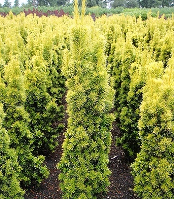 Хвоя м'яка, блискуча золотисто-жовта з зеленою полоскою. Плоди