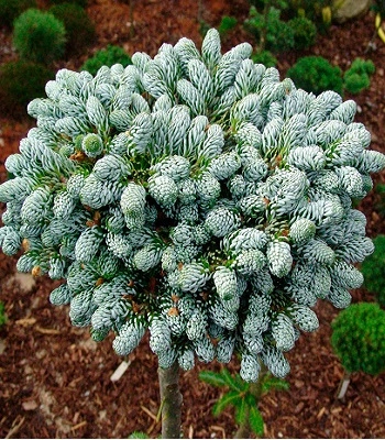Це дивовижний сорт, краса якого привертає увагу в будь-якому куточку саду. Зелена хвоя закручена так, що видно нижню білу сторону. За формою та кольором сорт нагадує наповнену колотим льодом страву на ніжці.Для посадки ідеально підійдуть відкриті, добре освітлені ділянки, з небагатими слабо-кислими ґрунтами. Розсад на момент відправлення:Н щеплення 0,8 м,Упакування: (Контейнер)
